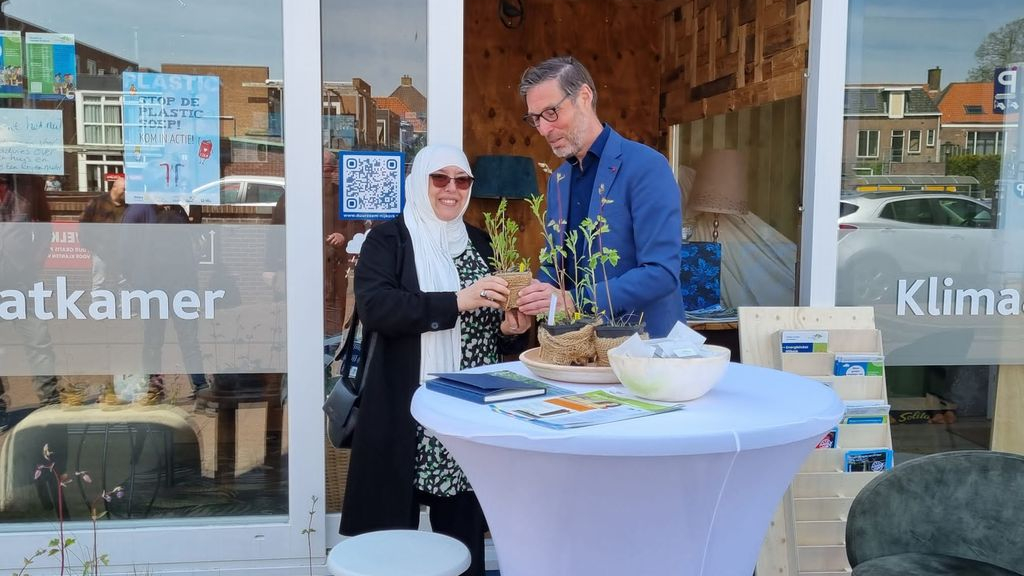 NIJKERK - Op donderdag 4 mei opende wethouder René Windhouwer opnieuw de deuren van de Klimaatkamer. Dit keer staat het pop-up-loket naast de supermarkt op het Nijkerkse Wheemplein. Fatima El Baghdadi was de eerste bezoeker en ontving daarom uit handen van de wethouder een gratis tuinplant.