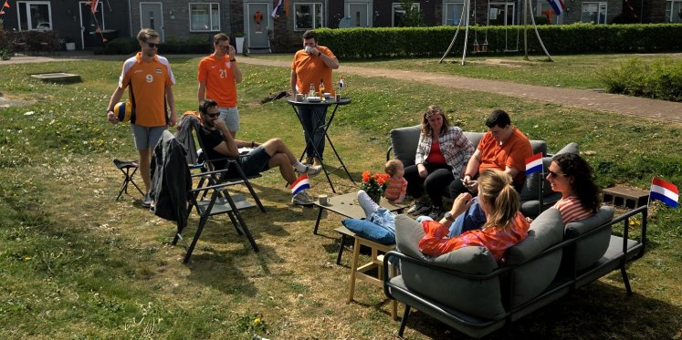 Mooi weer, vrienden en Koningsdag: een perfecte combinatie. In Barneveld maakte deze vriendengroep er een openbare huiskamer van.
