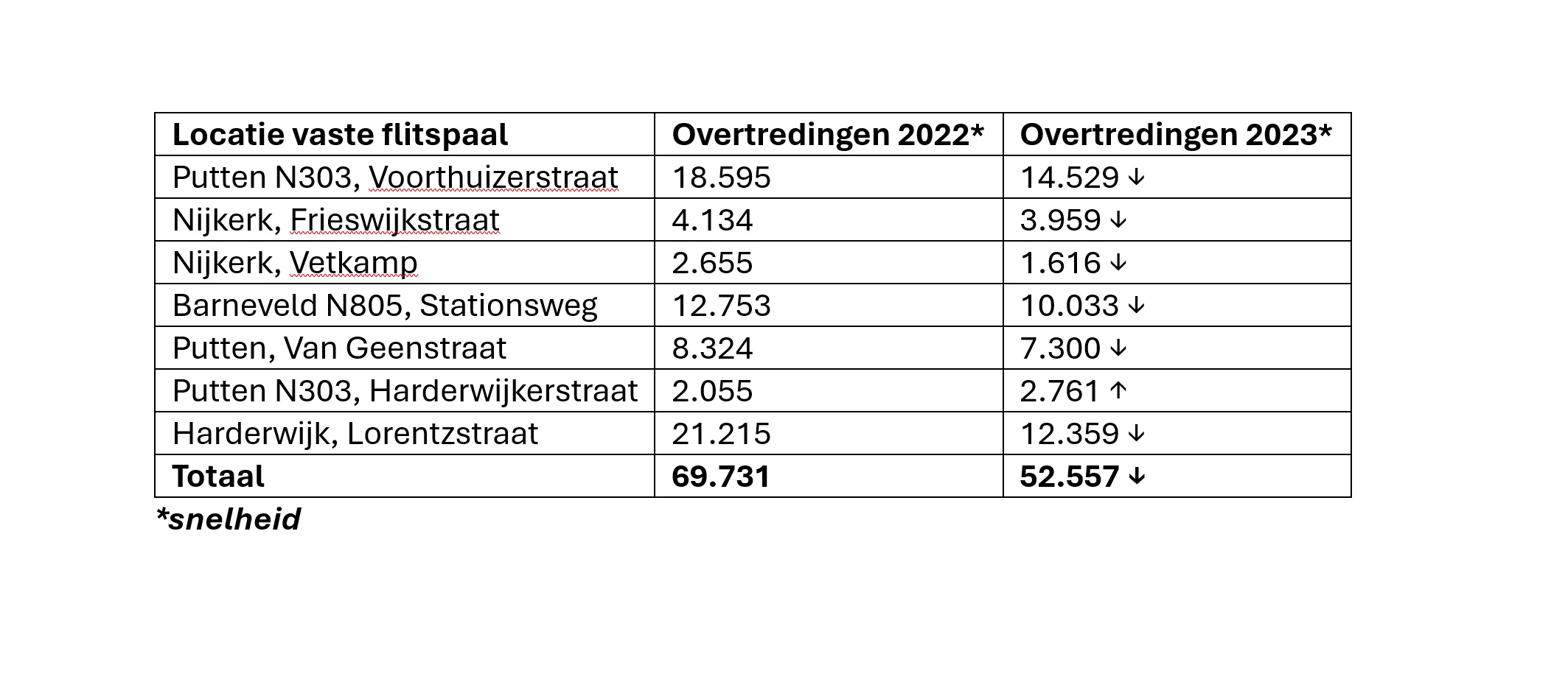 De grootste daling is te zien bij de flitspaal in Harderwijk. Gingen hier in 2022 nog 21.215 mensen in overtreding, waren dat er vorig jaar nog maar 12.359. De flitspaal bij de Harderwijkerstraat in Putten is de enige stijger in het rijtje.